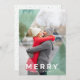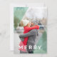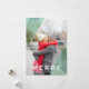 Célébrez les vacances avec des cartes photos de vacances amusants et modernes. Les cartes photos élégants disposent d'un cadre triangulaire vert et blanc, du mot "joyeux", d'un texte personnalisé et d'un espace réservé aux photos. L'arrière est orné d'un arrière - plan blanc avec des points verts clairs.