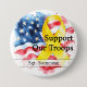 On the right side of the button, a bold yellow awareness ribbon is layered over the flag, representing support and appreciation for our troops. Centred on the ribbon, the phrase “Support Our Troops” is displayed in strong, bold lettering, making a clear and powerful statement.