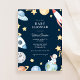 Invitation de Baby shower sur le thème de l'espace avec un astronaute de bébé aquarelle et des éléments spatiaux incluant des planètes, des étoiles, une fusée et des OVNI. Personnalisez avec vos informations ou cliquez sur "Cliquez pour customiser plus loin" pour modifier les styles, la taille et les couleurs des polices.