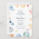 Invitation de Baby shower sur le thème de l'espace avec un astronaute de bébé aquarelle et des éléments spatiaux incluant des planètes, des étoiles, une fusée et des OVNI. Personnalisez avec vos informations ou cliquez sur "Cliquez pour customiser plus loin" pour modifier les styles, la taille et les couleurs des polices.