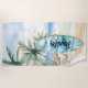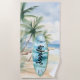 A watercolored sandy beach, ocean waves and palm trees as background, and a blue surfboard on the beach. Personalize and add a name.