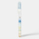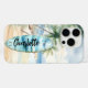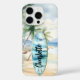 A watercolored sandy beach, ocean waves and palm trees as background, and a blue surfboard on the beach. Personalize and add a name.