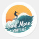 Stick on the good vibes with this “Surf More, Worry Less” sticker! 🏖️🏄♂️ A sleek surfer rides a crashing wave below a bright orange sunset, surrounded by stylized splash shapes and flowing beach typography. Printed on white background in teal, orange, and navy — waterproof and high-resolution. Great for laptops, bottles, boards, or gifts! 🧡🌊
