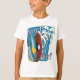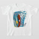 The design on this Kids T Shirt is two surf boards standing in the sand in front of two palm trees on a two tone star burst background. One surf board has a red design of a silhouetted woman on a white circle background. The other board is a blue abstract design of the sun setting behind waves.