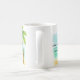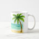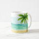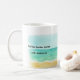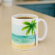 This coffee mug showcases a digital watercolor design of surf, sand, and a palm tree, complemented by the slogan "Coffee tastes better with ocean air." As a template, it's easily customizable for personalized touches. The AI artwork was created by Susang6.