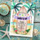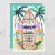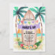 Beach theme birthday party invitation features a watercolor tropical paradise with sun, sea, palm trees and a surfboard adorned with a "Surf's Up" banner, festive string lights, hibiscus and palm leaves. The summery colours are gender neutral and work for any age, and whether you are having a backyard pool party, Hawaiian luau or a seaside shindig, this invitation will set a fun-in-the-sun tone for your celebration. Art by KL Stock