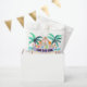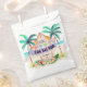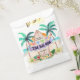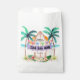 Cute beach theme birthday favour bags feature a tropical paradise with sun, sea, palm trees and a surfboard adorned with a "The Big One" banner, string lights, hibiscus and palm leaves. The colours are gender neutral, the text can be personalized to suit any person or age (1st or any "Big" birthday such as 21st, 30th, 50th, 100th!), these favour bags will add some summer ambiance to your celebration. Art by KL Stock