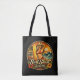 This retro inspired design captures vintage California surf shack energy with a blonde pin-up surfer clutching her surfboard, waves crashing onto the beach, with an antique van in the background. The ride the wave motto, paired with tropical hibiscus flowers complete the salty coastal sunset scene. This bold black tote is a stylish way to haul your everyday essentials island style, and makes a perfect beach bag too.