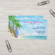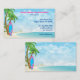This business card features a surfboard on a tropical beach with palm trees. The water is a beautiful blue and there are clouds scattered in the sky. -
