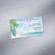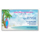 This magnetic business card features a surfboard on a tropical beach with palm trees. The water is a beautiful blue and there are clouds scattered in the sky. -