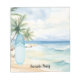 A watercolored sandy beach, ocean waves and palm trees as background, and a blue surfboard on the beach. Personalize and add your name.