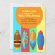 A colourful background and eye-catching surfboard designs make this invitation one you'll want to send and one they want to receive. (FP) <br/><br/>The card is easy to customize with your wording, font, font colour, paper shape options and choice of six paper types.<br/><br/>Not exactly what you're looking for? All our products can be custom designed to meet your needs at no extra charge.<br/><br/>Simply contact us at askpixieprints@aol.com.<br/><br/>Coordinating products available: Just ask us!