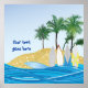 Surfboards on a tropical beach with palm trees poster print, featuring a tropical landscape. There are palm trees and surfboards on the sand and blue waves. It is a template and you can add your text or customize it to change image, text, font, colour. Colour scheme: Blue, green, white, yellow, tan
