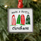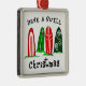 Holiday Surfer ornament, Christmas Gifts for surfing fans with picture of holiday Christmas patterned surfboards on the beach and holiday greeting, have a swell Christmas.