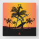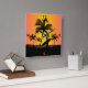 Surfer walking on beach with surfboard at sunset past tropical palm trees with glistening ocean in the background
