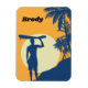 Surfer, palm tree, cliff, Sun, Moon, surfer. Beach scene with Surfer, bright orange, the sun or moon in tan and blue the dominant colors. The name Brody is completely customizable and can be changed to anything you'd like or eliminated together. A nice sized magnet to fill an empty space on a metal file cabinet or perk up your refrigerator.