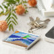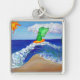 (The painting is of a green angel on an orange surfboard catching a wave. A sun glows in the background and palm tree gently sways on the beach. The wave is getting ready to crash on the beach smoothing the sandy surface. The green angel pays tribute to the Archangel Raphael whose colour is green and is known for bringing healing. The sun helps sustain life and through it plants such as palm trees strengthen and grow. The power of sun's energy is symbolized in the matched orange- yellow surfboard. The beach is clean and smooth. This painting was inspired by the "Wipe Out Cancer Angel". Instead of adding text of this painting, it was left open so you can your own wipe out, riding the wave, or other go with flow message to the beach, cloud, or sky. Proceeds from the sale of this keychain support DonnaBellas Angels, a 501(c)3 non-profit charity.