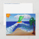 (The painting is of a green angel on an orange surfboard catching a wave. A sun glows in the background and palm tree gently sways on the beach. The wave is getting ready to crash on the beach smoothing the sandy surface. The green angel pays tribute to the Archangel Raphael whose colour is green and is known for bringing healing. The sun helps sustain life and through it plants such as palm trees strengthen and grow. The power of sun's energy is symbolized in the matched orange- yellow surfboard. The beach is clean and smooth. This painting was inspired by the "Wipe Out Cancer Angel". Instead of adding text of this painting, it was left open so you can your own wipe out, riding the wave, or other go with flow message to the beach, cloud, or sky.