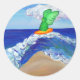 (The painting is of a green angel on an orange surfboard catching a wave. A sun glows in the background and palm tree gently sways on the beach. The wave is getting ready to crash on the beach smoothing the sandy surface. The green angel pays tribute to the Archangel Raphael whose colour is green and is known for bringing healing. The sun helps sustain life and through it plants such as palm trees strengthen and grow. The power of sun's energy is symbolized in the matched orange- yellow surfboard. The beach is clean and smooth. This painting was inspired by the "Wipe Out Cancer Angel". Instead of adding text of this painting, it was left open so you can your own wipe out, riding the wave, or other go with flow message to the beach, cloud, or sky.