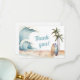 Cute surfing-themed thank you card for your baby shower guests featuring a watercolor illustration of a tropical beach scene with breaking waves, palm trees, sandy shores, starfish and surfboards, and "Thank you!" showcased in a fun retro blue script. On the back, personalize your thank you message or leave blank for a handwritten note.