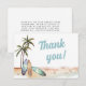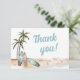 Cute summer surfing-themed thank you card for your baby shower guests featuring a watercolor illustration of a tropical beach scene with palm trees, sandy shores, starfish and surfboards, and "Thank you!" showcased in a fun retro blue script. On the back, customize your thank you message or leave blank for a handwritten note.