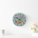 GONE SURFING, reads the driftwood notice on this beach themed wall clock. 12 scallop shells fixed to a circle of rope are used in place of numerals. Beach hut/wood effect background with shells, starfish, seahorse and fishing net decoration.