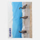 A digital rendering of three Canada Geese contemplate heading out into the incoming surf on the shore of Lake Pend Oreille at Sandpoint, ID; blue mountains are in the distance. Text reading "IDAHO" also appears.