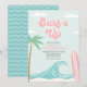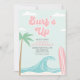 Surfs UP! Surfing Beach Birthday invite with turquoise waves and pink surf board.