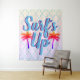Summery surf's up sunset palm trees wall tapestry with a quatrefoils background.
