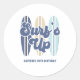 Surf's Up! surfboards beach birthday invitation sticker in navy blue and light blue.