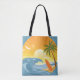 Round design of a beach scene with a small island sporting a palm tree and surf board rising from the sand, surrounded by blue waves under the setting sun. This tote bag is fully customizable.