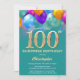 Surprise 100th Birthday Teal and Gold Colourful Balloons and Confetti Invitation. For further customization, please click the "Customize it" button and use our design tool to modify this template.