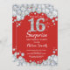 Surprise 16th Birthday Invitation. Red and Silver Rhinestone Diamond Red Background. Elegant Birthday Bash invite. Adult Birthday. Women Birthday. Men Birthday. For further customization, please click the "Customize it" button and use our design tool to modify this template.