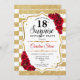 Feminine white, red design with faux glitter gold. Features stripes, red roses, script font and confetti. Perfect for an elegant birthday party. Can be personalized to show any age. Message me if you need further customization.