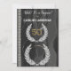 An elegant custom surprise birthday invitation with the gold gilded number 50th on a black silk pattern decorated with white pearls. The number and the photo are framed with a laurel diamond pattern.