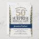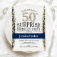 Surprise 50th Birthday Party Invitation. Elegant design in faux glitter gold, white and navy. Features script font and diamond number. Perfect for a stylish women's or men's bday celebration.
