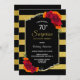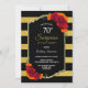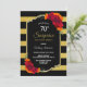 Black and gold striped surprise 70th birthday dinner party invitation featuring elegant red and orange floral displays. Text is fully customizable to enable you to include all of your own information for your birthday celebration. (NB: Faux glitter has been featured on this invitation.)