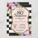 Surprise 80th Birthday Invitation for women. Black and Gold Birthday Party Invite. Gold Glitter. Purple Watercolor Floral Flower. Black and White Stripes. Printable Digital. For further customization, please click the "Customize it" button and use our design tool to modify this template.