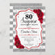 Feminine white, red design with faux glitter silver. Features stripes, red roses, script font and confetti. Perfect for an elegant birthday party. Can be personalized to show any age. Message me if you need further customization.