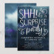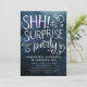 Elegant adult surprise birthday party invitation featuring navy blue watercolor background with white typography text that says "SHH! it's a SURPRISE party" with swirls. Customize this template card by adding your own party information.
