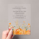 Acrylic invitations are the hottest invitation trend this year. Fall pumpkins are nestled in delicate golden yellow and orange wildflowers to create an elegant aesthetic. All of the text is editable so you can easily craft your own special mood.