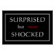 Display "Surprised but never Shocked" phrase poster on your wall at home or at school. Black background with white and red lettering.