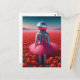 An astronaut with a disco ball head in a silver suit with a pink tutu stands in a poppy field