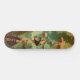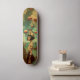 Surreal fantasy wall art skateboard. A girl with short blue hair and bangs, wearing a white cap on her head is standing in the sea surrounded by floating islands. She has many black bandages around one of her arms and wears a skirt that covers part or all of it. The background features a surreal landscape with houses made from mushrooms and clouds hanging over the water.
