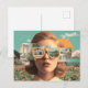 A woman wearing sunglasses with surreal landscapes reflected in the lenses stands before a bright backdrop. The scene combines different elements from architecture and nature.