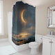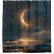 The image shows a golden crescent moon suspended in a dark, cloudy sky above a body of water. The moon appears to be made of or emitting golden light, with streams of sparkling particles falling from its lower edge towards the water. The water's surface reflects the golden light, creating a shimmering effect. The sky is filled with dark, ominous clouds, contrasting with the warm glow of the moon.