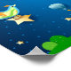 Fantasy landscape by night with hot air balloons, wave of stars, birds and flying fishes. Surreal art