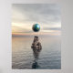 Digital artwork depicting the planet Earth mysteriously hovering above a stacked pile of rocks, somewhere in an ocean.