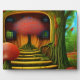 Tabletop art plaque featuring an AI generated surreal digital art painting of a tree growing within a carved out tree with stairs in a magical forest.