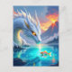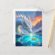 A sci fi surreal postcard to keep in touch with a friend. A beautiful illustration white dragon looking at a goldfish while volcanos erupt in the background.